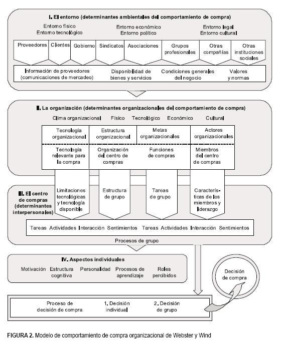 El modelo de Webster y Wind considera específicamente cuatro grupos de variables, las cuales se relacionan entre sí y determinan el proceso de compra. Estas son: ambientales, organizacionales, interpersonales (centro de compra) e individuales. Se puede observar que en ambos modelos se presentan aspectos tanto externos como internos de la organización, teniendo una mayor influencia los de origen interno. En la Figura 2 se presenta este modelo.