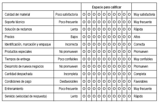 Luego la empresa califica el desempeño de cada uno de los diferentes proveedores en cada variable, a través de una escala de diferencial semántico, para de esta forma identificar qué tan lejos o cerca se encuentra cada proveedor del perfil ideal. Por otro lado, permite identificar fortalezas y debilidades de cada competidor, para así aprovechar oportunidades de mejoramiento y atacar necesidades insatisfechas.
