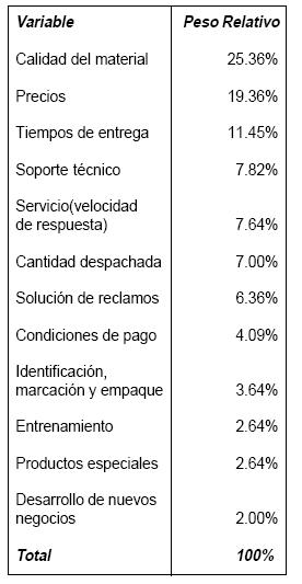 Asimismo, quien diligencia puede adicionar otras variables que no estén incluidas previamente. Cada entrevistado debe asignar un valor entre uno y diez a cada variable, dependiendo de qué tan importante considera cada una. Se asignan más puntos a las variables más importantes, y menos a las de menor relevancia, para luego ponderar la calificación de cada una. La valoración de la importancia de cada una de estas variables permite conocer cuáles tienen mayor valor para la empresa y cuáles no. De esta manera, el proveedor puede fortalecer aquellos aspectos críticos que influyen en la decisión de su cliente y enfocarse en desarrollar elementos de diferenciación, para así generar preferencia de compra. Este enfoque permite, con base en las necesidades de los clientes, adaptar la oferta de la compañía al mercado.