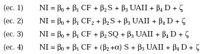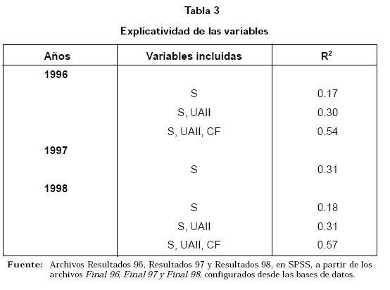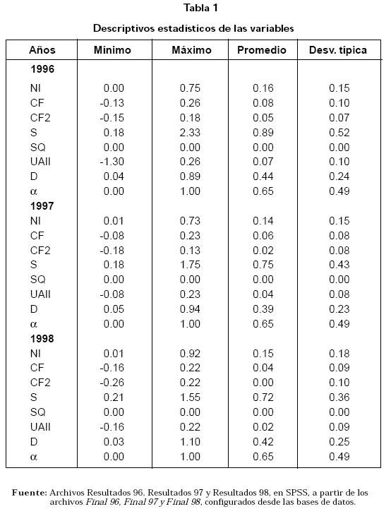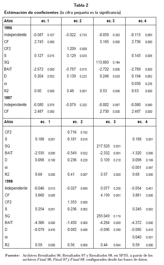 El estudio plantea correr cada una de las ecuaciones anteriores con los datos de las empresas para cada uno de los tres años de estudio, utilizando el paquete SPSS Versión 10.0 para análisis de regresión lineal múltiple.