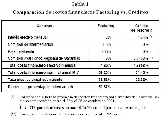 Como medida complementaria, y una vez saneado el problema de la cartera actual, se hace necesario acudir a otras fuentes de financiación más favorables desde el punto de vista financiero, y es por ello que se plantea la posibilidad de tomar créditos ordinarios a través de sector financiero, a un plazo máximo de doce meses; obviamente esto exigía ofrecer garantías lo suficientemente atractivas a las entidades financieras, para lo cual existe la posibilidad que tienen las pymes de recurrir a la garantía del Fondo Regional de Garantías a través de una garantía automática que avala hasta el 50% del monto de los créditos, reconociendo una comisión anual anticipada del 1.75% sobre el monto avalado. Esta alternativa disminuye los costos financieros en la proporción que se presenta en la Tabla 1.