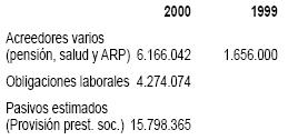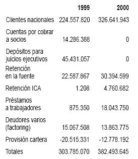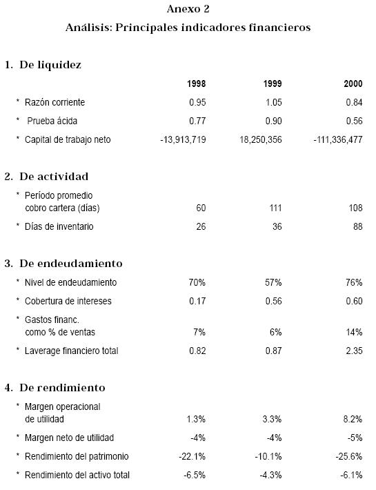 La liquidez de esta compañía se basa en préstamos con dos entidades financieras: Factoring de Occidente S.A. e Ingefin, a quienes se les entrega como respaldo tres garantías: cheque posfechado, pagaré y endoso de facturas, con un promedio de pago a noventa días. A diciembre 31 de 2000 esta suma ascendía a $527.372.976.