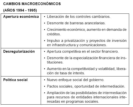 De otra parte, los cambios macroeconómicos tales como apertura económica, desregulación y la política social del gobierno habían generado en 1995 un ambiente altamente dinámico y competitivo, ampliando las oportunidades e introduciendo nuevos retos para la SEF pero generando también grandes riesgos para el modelo.