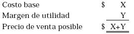 En esta forma, el costo más el margen de utilidad es la base del precio propuesto. El tamaño del margen depende del objetivo deseado en cuanto utilidad operativa. Los precios objetivo pueden basarse en una serie de diferentes márgenes, que a su vez dependen de diferentes costos. Existen pues varias maneras de llegar al mismo precio objetivo: Mostremos como ejemplo una empresa cuyos costos para el producto R-10 son dados a continuación: