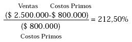 Así las utilidades objetivo son el 212,50% de los costos primos o $ 1.700.000- ($ 950.000+350.000)= $ 400.000.