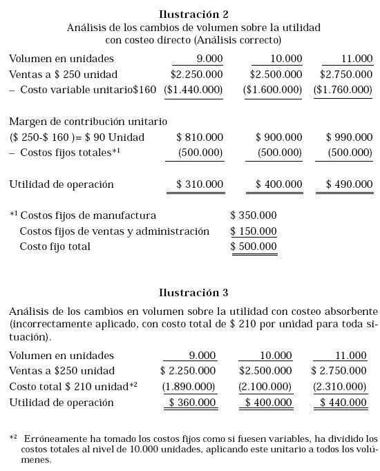 El análisis incorrecto de la ilustración No. 3 muestra cómo los administradores pueden equivocarse, si el costo total por unidad de $ 210 se usa para predecir los efectos de los cambios en volumen sobre las utilidades operativas. Pensemos que un administrador utiliza la cifra de $ 210 para pronosticar una utilidad de operación de $ 360.000, si la compañía vende 9.000 unidades en vez de 10.000. Si en cambio, la utilidad operativa real es de $ 310.000, como pronostica el análisis correcto, el administrador quizá quede completamente despistado. Por esto recomendamos usar el sistema de costeo directo ya que presenta rápidamente las relaciones entre los costos variables, los costos fijos y los cambios potenciales de los precios de venta.
