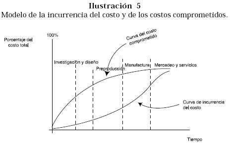 La curva inferior -incurrencia del costo- muestra los costos acumulados, como porcentaje del total incurrido en las diferentes funciones de la cadena de valor. La curva superior muestra los costos comprometidos. Como puede verse, la ilustración destaca la ampliamente generalizada diferencia entre el momento en que se comprometen los costos y la incurrencia en ellos. En la ilustración, una vez diseñado el producto y sus procesos de producción, más del 85% aproximadamente, de sus costos, están comprometidos, aunque en realidad se ha incurrido en menos de 12% de los costos. Así, al final de la etapa de diseño ya se han comprometido los materiales, los procesos de fabricación con sus costos de mano de obra y gastos de fabricación, como también algunos procesos de mercadeo y servicio al cliente.