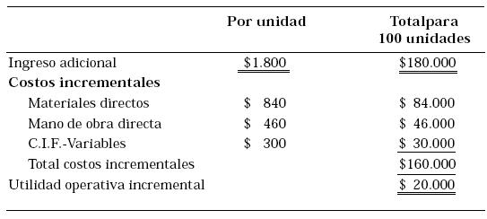 Por lo tanto, aun cuando el precio ofrecido en el pedido especial de $1.800 por unidad está por debajo del precio unitario normal de $2.500; y del costo unitario total de $2.000 en condiciones «normales» y dado que no requiere ningún costo fijo o variable de tipo operativo, resulta en un incremento neto de la utilidad operativa. En general, una orden especial es rentable cuando los ingresos incrementales excedan a los costos incrementales de la orden. Es necesario recalcar la importancia de estar seguros de la existencia de capacidad ociosa, que implica la carencia de nuevos costos fijos y la no repercusión en las ventas normales al precio vigente. Si la compañía necesita nuevos costos fijos para atender la orden, estos deberían incluirse como incrementales.