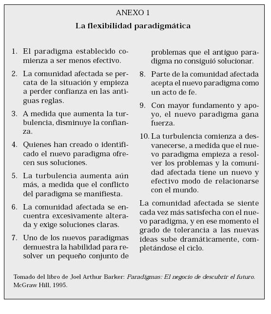 Como una conclusión a estas observaciones se me ocurre que en tiempos turbulentos como los que actualmente vivimos, resulta competitivo para la gerencia desarrollar y practicar la flexibilidad paradigmática e identificar los momentos generadores de los cambios paradigmáticos. Ser tolerantes con las nuevas ideas, ser tolerantes con las personas que sugieren esas nuevas ideas; ser tolerantes con las personas que ven el mundo de una manera diferente a la nuestra. Pero aún hay mucho más por conocer, por aprender. Estar dispuestos a aprender otra vez, a ver con una nueva luz lo que hemos visto antes, a explorar nuevos territorios que se abren cuando cambiamos nuestros paradigmas. Este es el reto al cual nos enfrentamos. En el Anexo 1 aparece una guía para la práctica de la flexibilidad paradigmática.