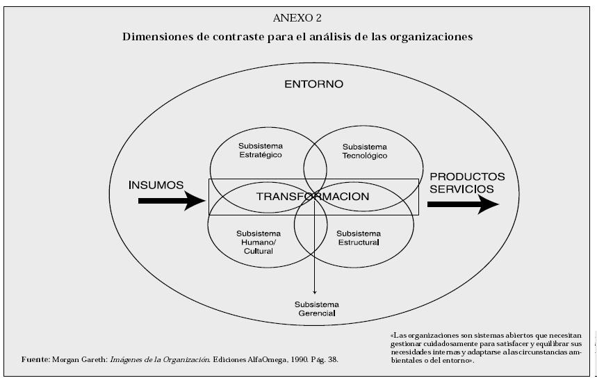 La teoría de sistemas se relaciona con la teoría organizacional. La teoría clásica o tradicional usó los planteamientos de sistema cerrado. La teoría moderna se ha orientado a la consideración de la organización como un sistema abierto en interacción con su entorno. Las organizaciones según Kast y Rosenzeweig7 como los organismos, pueden ser considerados como un conjunto de subsistemas interactuantes. (Ver Anexo 2). Estos pueden definirse de la siguiente forma: