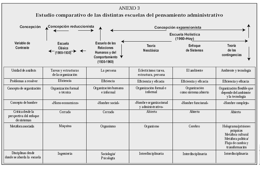 En el Anexo 3 aparece un cuadro comparativo de las distintas escuelas del pensamiento administrativo.