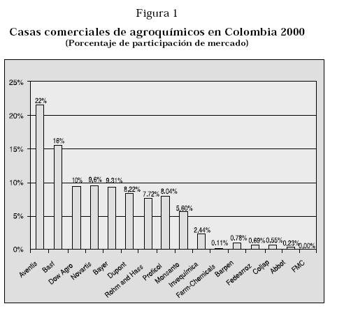 Las compañías líderes del mercado son Aventis, Basf, Dow Agro, Novartis, Bayer, Dupont, Rohm and Haas, Proficol y Monsanto, las cuales se caracterizan por un amplio portafolio de productos, una fuerte organización de ventas, agresivas campañas de promoción, altas inversiones en publicidad y mercadeo y especialización de productos. Igualmente se encuentran participando del mercado, aunque en menor porcentaje, las compañías Invequímica, Barpen, Fedearroz, Coljap, Abbott y FMC (Figura 1).