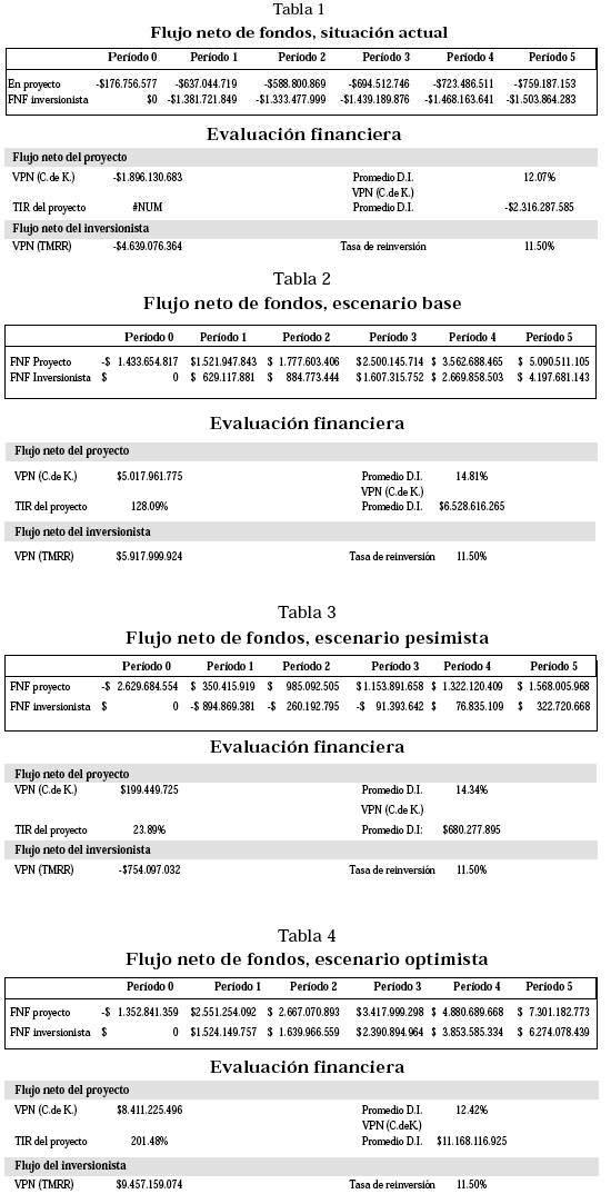 Dentro de los resultados obtenidos en los diferentes escenarios, los flujos de caja o flujos netos de fondos del proyecto nos presentan un parámetro de comparación claro del comportamiento financiero de la empresa en cada uno de dichos escenarios (Tablas 1, 2, 3 y 4).