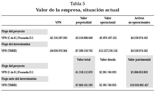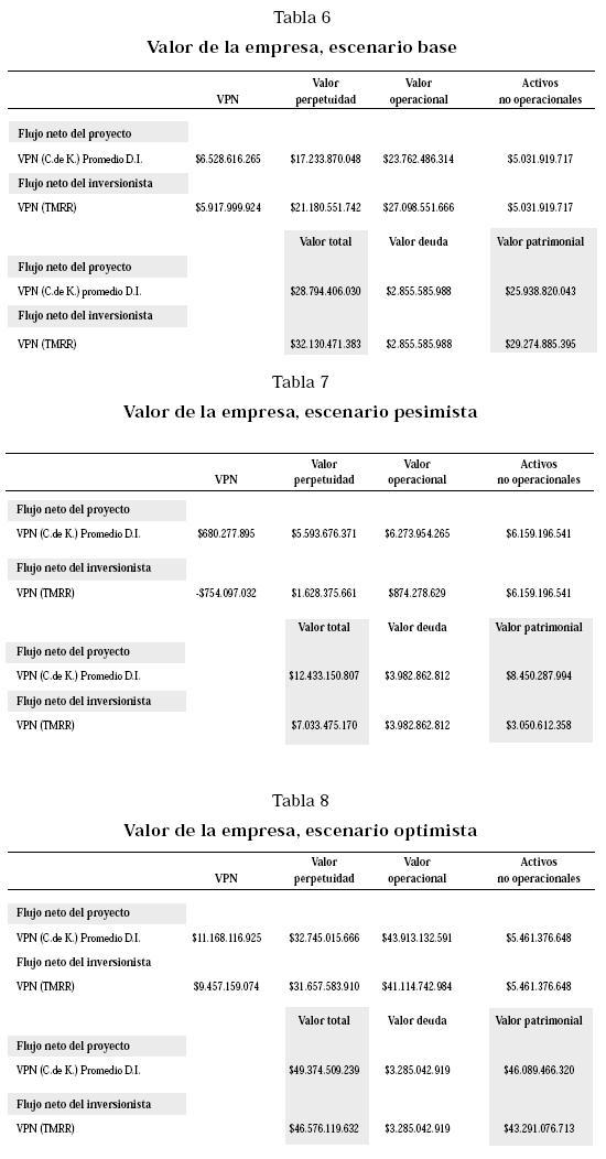 Por otra parte, la relación entre aportes de los socios y apalancamiento financiero mejora; esto lo demuestra la razón de endeudamiento y el respectivo cubrimiento de intereses; sin embargo no se garantiza el apoyo mediante recursos externos necesarios para el inicio y puesta en marcha del proyecto. El cambio sustancial en las ventas, registra una mejora en los costos del servicio a la deuda; lográndose una estructura financiera adecuada para el proyecto. La evolución de los flujos netos de fondos, para el proyecto e inversionista es positiva a partir del período 1 (Tablas 2, 3, 4). El costo de capital promedio ponderado después de impuestos (WACC)4 se ubica en valores inferiores a la rentabilidad de los activos; por lo anterior, la operación del negocio comienza a generar valor agregado; obteniéndose un valor patrimonial de la empresa positivo en los tres escenarios (Tablas 6, 7, 8).