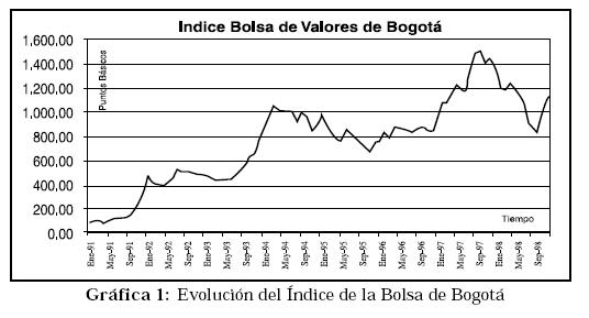 Como se puede apreciar en la Gráfica 1, del índice de la bolsa de Bogotá,ii ésta traía un crecimiento sostenido desde principios de la década, con algunas fluctuaciones en sentido negativo, pero la tendencia global era bastante positiva, tanto así que llegó muy cerca de los 1.500 puntos básicos a finales de 1997. Como es conocido, la bolsa refleja muchos de los acontecimientos macroeconómicos de cada país, por lo tanto, es razonable atribuir esta tendencia positiva a fenómenos como la apertura económica, que hicieron que nuestro país comenzara a competir con las empresas de los países desarrollados, y ampliara sus mercados al mundo. Este es un proceso que todavía no ha terminado de ser asimilado completamente por la economía. El crecimiento de la bolsa fue muy vigoroso y con una marcada tendencia hasta octubre de 1997, año que fue muy negativo, pues el ya posesionado presidente de la república Ernesto Samper, y el deterioro de sus relaciones con Estados Unidos frenaron este desarrollo. Fuera de esto, en ese año (2 de julio de 1997) comenzó la crisis asiática, con la vertiginosa devaluación de sus monedas con respecto al dólarii, principalmente causada por tener un sistema financiero doméstico pero con libres flujos de capital y la influencia del sensible mercado cambiario. Lo cual al mercado cambiario colombiano, en el que intervino el Banco de la República subiendo los tipos de interés para defender la banda cambiaria, le ocasionó una disminución de la inversión tanto doméstica como extranjera, que posiblemente llevó al inicio de la recesión del país, el cual se encontraba en un momento de bonanza para las mafias, que ocasionaba grandes inyecciones de dólares al mercado. Por lo tanto, desde octubre de 1997 la tendencia es marcadamente a la baja.