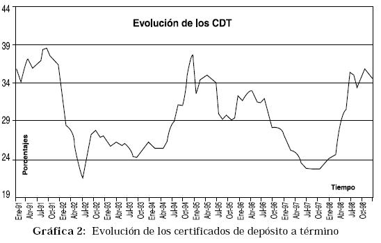 En el período analizado, el rendimiento de los CDT se caracterizó por tasas bastante elevadas, con algunos movimientos significativos en el mediano plazo, pero con mucha gradualidad en los movimientos mismos. El retorno se situó alrededor del 22%, pero con bastante estabilidad, medida en términos de la varianza de los rendimientos (Ver Gráfica 2).