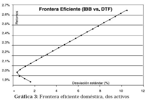 Usando los procedimientos matemáticos del modelo y partiendo de los datos de la Tabla 1 se calculan la rentabilidad y las desviaciones estándares para cada combinación posible de las proporciones de cada uno de los dos activos, acciones y CDT, lo cual al graficarlo en un diagrama de dispersión nos muestra la frontera eficiente, los ejes son la desviación estándar (eje x), y los retornos (eje Y), del portafolio. La frontera eficiente representa el conjunto de carteras, para cada nivel de riesgo que no tiene una combinación mejor. Cualquier cartera por debajo de la frontera eficiente representa una combinación que no es la óptima, desde el punto de vista que no es racional tener una combinación de activos con igual riesgo que otra pero con menos rentabilidad esperada. Si queremos que el modelo no permita posiciones cortas, todos los valores de las proporciones deben ser positivos, los extremos de la gráfica representarán cada uno (sólo en el caso de dos activos), la desviación y la rentabilidad de cada uno de los activos que la conforman (Ver Gráfica 3).