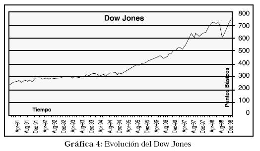 Uno de los índices (posiblemente el más conocido) usados para medir el desempeño de la bolsa de Valores de Nueva York es el Dow Jones; este, al igual que todos los índices de las bolsas dan una idea a los inversores de en qué sentido se mueven los mercados, y qué tan pronunciadas son las fluctuaciones. Como se aprecia en la gráfica de evolución del Dow Jones, para la década en estudio ha estado muy estable, con una tendencia muy positiva, posiblemente inducida por los grandes desarrollos tecnológicos que desde esta década y hasta nuestros días ha liderado Estados Unidos (Ver Gráfica 4).
