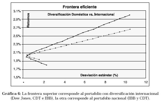 Por ejemplo, si invirtiendo en el portafolio nacional queremos que éste rente 2.5%, el riesgo del portafolio será 7.97% (en la frontera eficiente, línea delgada con triángulos) pero si se invierte en el portafolio internacional en busca de la misma rentabilidad de 2.5% dicho portafolio corresponde a un riesgo de 4.84% (en la frontera eficiente, línea gruesa con puntos), mucho menor que el equivalente al nacional para este mismo nivel de rentabilidad esperada.