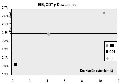 Como se puede apreciar, se mantiene la relación fundamental, y directa, entre la rentabilidad y el riesgo (desviación estándar), el IBB tiene una mayor rentabilidad pero es castigado con un riesgo mucho mayor que el de los CDT (10.48 > 0.38). Es claro que por las pocas fluctuaciones de los CDT en el interés, tiene una desviación casi tan pequeña como los activos sin riesgo.