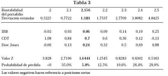 Existen algunas aproximaciones al problema, sin embargo la práctica financiera utiliza un procedimiento más intuitivo, tomando las decisiones de inversión basadas en las probabilidades de pérdida o las probabilidades de fallar en lograr un determinado nivel objetivo de rentabilidad. Si se asume que los retornos son normalmente distribuidos, un supuesto que es fácilmente verificable en la práctica, es simple transformar los parámetros de rentabilidad y riesgo a un marco de probabilidad de pérdida, tal como se ilustra en la Tabla 3.