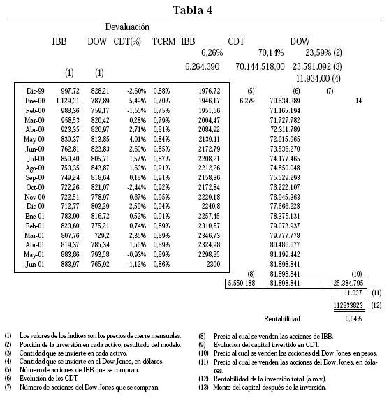 Los datos relacionados con cada activo a la fecha del 1o. de enero de 2000 y su respectiva evolución son los que aparecen en la Tabla 4. Allí se aprecia cómo fue el desarrollo de cada uno de los activos que conforman el portafolio internacional, mes a mes.