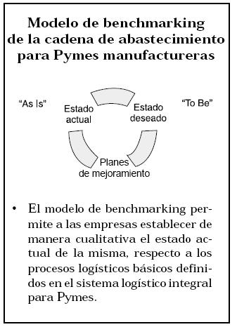 El modelo de benchmarking de la cadena de abastecimiento para Pymes manufactureras representa una guía para el mejoramiento de los procesos logísticos de una Pyme dedicada a la producción.