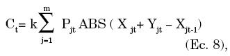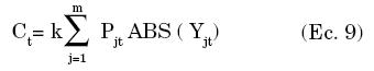 donde Xjt (Xjt-1)representa el número de acciones que se requieren para mantener el portafolio EW en el período t (t-1) de la empresa j y Yjt el número de acciones requeridas por el ajuste de posiciones del PI. El término entre paréntesis representa el cambio neto en el número de acciones por empresa, y la función ABS significa valor absoluto puesto que este costo se paga ya sea que se vendan o se compren acciones. El costo porcentual de la transacción es k, y Pjt es el precio de la acción j en el período t.