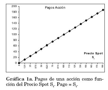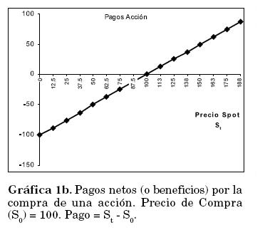 Al comprar una acción S sabemos que el pago final recibido por la acción al momento de venderla (liquidar la posición) corresponde al precio spot St (Pago = St ). La Gráfica 1a nos muestra este comportamiento. Para calcular el pago neto se debe restar el costo inicial de la acción S0. El pago neto se expresa como St - S0. La gráfica 1b representa estos beneficios.