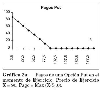 Cuando la opción puede ejercerse en cualquier momento entre su emisión y expiración se conoce como una opción tipo americano, en caso contrario la opción se denomina tipo europeo. Los pagos recibidos al ejercer la opción se observan en la Gráfica 2a.