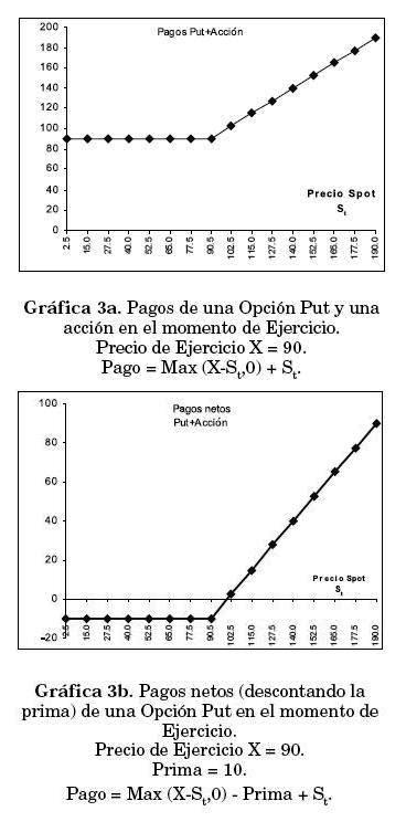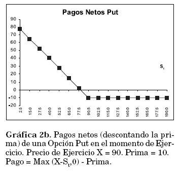 Cuando el precio de ejercicio es superior al precio spot de la acción (X>St), el propietario de la opción la ejerce, pues puede vender la acción S a un valor mayor al del mercado. Su utilidad es entonces St-X. Cuando X < St el propietario no ejerce la opción pues puede vender la acción a un precio mayor que el pactado en la opción; su utilidad en este caso es 0. En ambos casos debe restarse la prima pagada por la compra de la opción si se quieren obtener los pagos netos de la operación (Gráfica 2b).