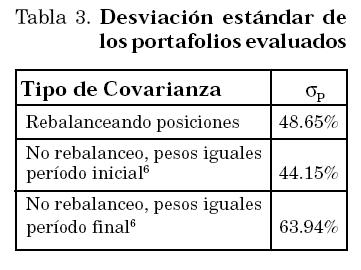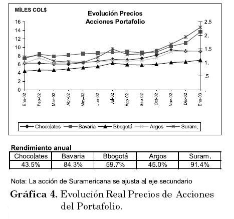 Los resultados se reportan en la Tabla 2, para un peso relativo de 20% para cada acción (Portafolio "Equally weighted"). Los datos corresponden a los precios reportados por la Superintendencia de Valores al inicio de cada mes para las acciones que conforman el portafolio. El año 2002 no se incluye puesto que se utilizará para evaluar los resultados de la aplicación de las dos metodologías empleadas.