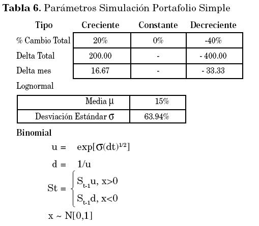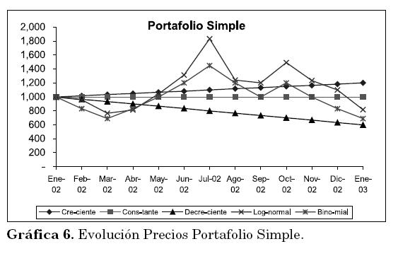 una variable aleatoria con N[0,1], dt=1/12 (Benninga 2000).Con respecto al comportamiento simulado de los portafolios simples éstos siguen los parámetros establecidos en la Tabla 6, los cuales se visualizan en la Gráfica 6.