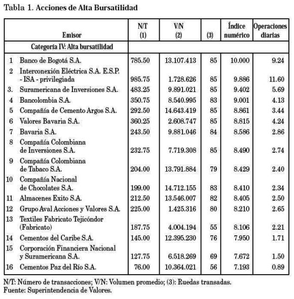 A este respecto el reporte de octubre de 2002 de la Superintendencia de Valores consigna que solamente 16 acciones (de 59 transadas y 122 inscritas) clasifican como acciones de alta bursatilidad. La acción de mayor bursatilidad (Banco de Bogotá) registra una media de 785 operaciones mensuales con un volumen de COL$ 13.107.413 por operación. El número de operaciones diarias promedio para esta acción fue de 9.24. La acción de menor bursatilidad dentro de este grupo (Cementos Paz del Río) registra menos de una operación promedio diaria. En conjunto durante el período reportado (cuatro meses anteriores al reporte) sólo se realizaron 64.67 operaciones diarias de compraventa de acciones.