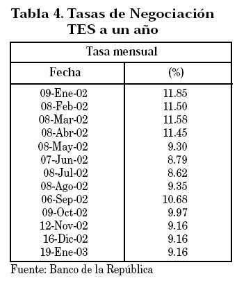 Banco de la República. Estadísticas Títulos de Tesorería. http://www.banrep.gov.co (Enero 2003).