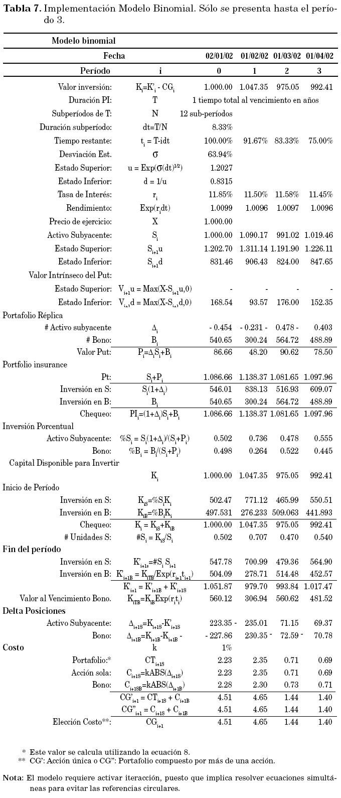 El artículo revisa la teoría de opciones y propone un método para la implementación del "Portfolio Insurance" basado en el modelo binomial, el cual es evaluado en oposición al modelo de Black-Scholes. Usando datos reales y simulados se encuentra que el método de Black-Scholes se desempeñamejor en condiciones "inestables"; el modelo binomial, en cambio, obtiene mejores resultados con tendencias definidas en los precios de las acciones (crecientes, decrecientes o estables durante un período extendido).