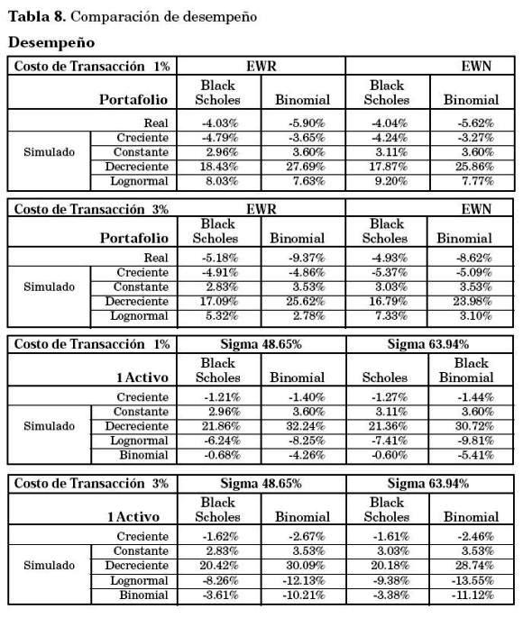 En cuanto a los resultados de usar portafolios rebalanceados periódicamente (EWR) o no (EWN), los datos no son concluyentes. Con costos de transacción del 1%, el modelo Black- Scholes reporta mejores resultados para los datos reales (relativamente crecientes) y la simulación decreciente para el portafolio EWR. Al incrementar los costos de transacción al 3% los resultados cambian un poco; en el caso de los datos reales, el costo de rebalancear el portafolio parece ser demasiado alto y el portafolio EWN se comporta mejor. Sin embargo, para la simulación con datos crecientes el resultado es el opuesto, el portafolio EWR es superior al EWN con costos de transacción de 3%.
