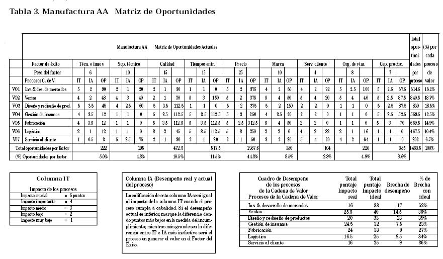 Con base en este modelo se diseñó un instrumento que se ha llamado Matriz de las Oportunidades, producto de las experiencias del autor, y se presenta a continuación tomando como ejemplo las dos empresas: Manufactura AA y Servicios BB, donde se han diseñado y se están implementando los Planes Estratégicos con la dirección del autor.