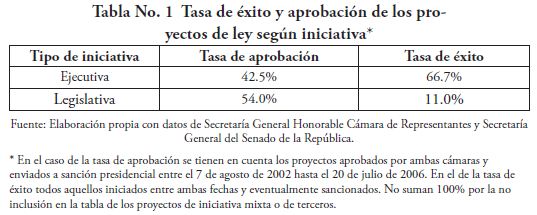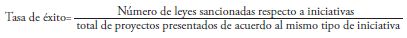 Dentro de este marco, el primer elemento que tendremos en cuenta es la eficacia de cada uno de ellos en lo referido a la producción legislativa, que será evaluada a través de la ''tasa de éxito''. Ésta representa la relación existente entre el número de leyes aprobadas de acuerdo al tipo de iniciativa –ejecutiva o legislativa– con el total de los proyectos radicados por cada una de esas ramas respectivamente4 y nos permite observar la capacidad de cada una a la hora de promover sus propios proyectos –cuanto más alta sea la tasa, mayor habrá sido su capacidad de hacerlo.