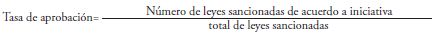 Habiendo arribado a este punto, complementaremos la noción de eficacia de cada poder, brindada por la tasa de éxito, con la ''tasa de aprobación''. Ésta equivale al resultado del cálculo de la relación de las leyes sancionadas según iniciativa sobre el total de las de las mismas,9 y su utilidad reside en el hecho de que nos brindará una muestra del peso que cada una de estas ramas del poder político posee sobre el total de la producción legislativa.10