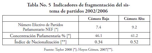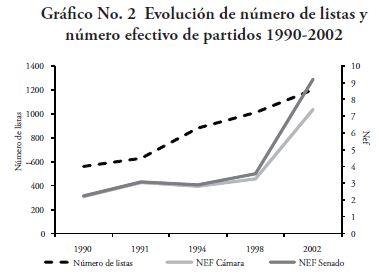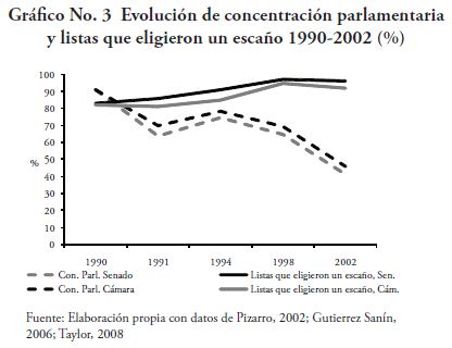 Una clara lectura de esta situación puede realizarse ya sea a través del pico alcanzado por el número de listas –1205, presentadas para ocupar los 268 curules de ambas cámaras– como en el sensible aumento del número efectivo de paridos y la disminución de la concentración legislativa. Así, aún cuando la situación no es completamente novedosa, nunca había llegado a alcanzar una intensidad como la que puede ser observada a inicios del nuevo siglo.