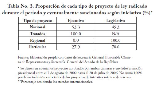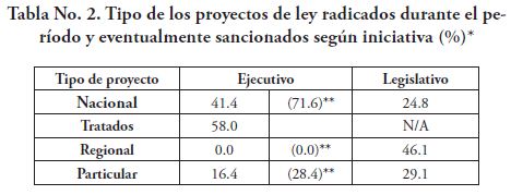 De hecho, en la Tabla No.2, puede observarse una clara especialización por parte del ejecutivo en los proyectos de carácter nacional –excluyendo los tratados internacionales de los que posee el monopolio de iniciativa– mientras que en el caso del legislativo la distribución es sensiblemente más pareja. Esta tendencia es normal, sobre todo, teniendo en cuenta que, como mencionamos, los legisladores representan mucho más claramente intereses sectoriales o regionales mientras que el ejecutivo posee la responsabilidad del ejercicio del gobierno.