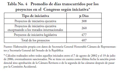 También es importante aclarar que este trabajo no representa un intento de evaluación de la calidad de la democracia colombiana, mucho menos del funcionamiento integral del sistema político de ese país, sino, como aclaramos anteriormente, de un análisis de la mecánica de interacción entre poderes que será efectuado de forma macro. Realizaremos un estudio estático del período, tomando al cuatrienio como unidad temporal, sin profundizar en los cambios que pudieron producirse dentro del mismo y concentrándonos, específicamente, en los proyectos de ley y no en otros tipos de producción legislativa.2 Así partimos de la revisión de tres elementos que consideramos esenciales, como el volumen de legislación producido por cada una de las mencionadas ramas del poder, además de su eficacia y eficiencia en ese mismo campo.