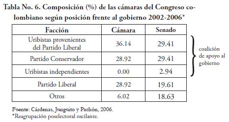 De este modo, manteniéndose por fuera de las etiquetas partidarias tradicionales, fuertemente desgastadas, pero sin prescindir de su soporte dentro del Congreso, el gobierno logró establecer una contundente base de apoyo tanto legislativo como electoral. Es decir, consiguió combinar el sostenimiento de buena parte de dirigentes y votantes tradicionales e independientes, evitando ser apresado por una sigla partidaria específica, manteniendo así abiertas sus opciones de conservar diferentes soportes de forma simultánea. De este modo, las distintas listas comenzaron a abandonar la matriz partidaria original, alineándose detrás del presidente y constituyendo una fuerza inédita como representó el uribismo que, como ya pudo observarse, se constituyó como una coalición legislativa y no como un partido de gobierno (Gutiérrez Sanín, 2006).24