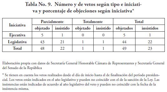 A profundizar esta situación, también contribuyó la singular mecánica del sistema de veto, que para ser válido debe ser aprobado por la mayoría absoluta de ambas Cámaras, otorgándole así la última palabra al Congreso o, en su defecto, a la Corte Constitucional,31 pero nunca al presidente –en el caso que las observaciones que este haya realizado a un proyecto aprobado por ambas cámaras no sean ni ratificadas ni insistidas por el legislativo se archivará, manteniéndose el status quo, situación que disminuye el poder de ''corrección'' con que cuenta el jefe del ejecutivo.32