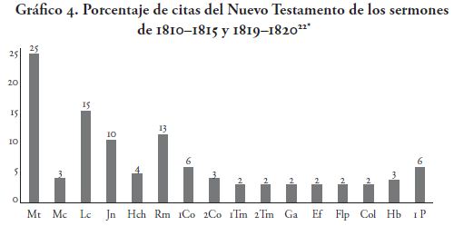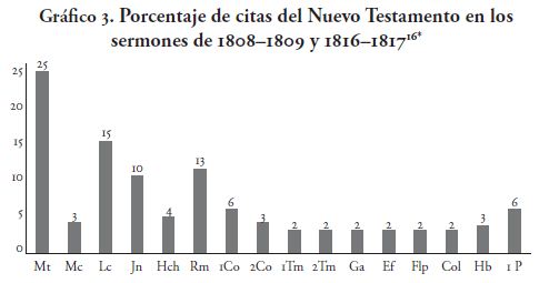 Como apreciamos en el Gráfico 3, entre los escritos escogidos del Nuevo Testamento el Apocalipsis, Mateo y Romanos fueron los de mayor preponderancia. El interés en estos textos se debió básicamente a que los sacerdotes articularon sus visiones escatológicas con el debate en torno a las formas de gobierno.