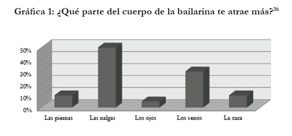 La popular novela Sin tetas no hay paraíso del colombiano Gustavo Bolívar (2005), recrea una tragicómica dinámica en la que los implantes mamarios resultan, para las jóvenes, instrumentos efectivos de movilización social.22 En México son más los glúteos que los senos el fragmento corporal que posee la carga erótica. Así se expresa en la gráfica y en los relatos de las bailarinas: 'La verdad sí me ayudó porque antes de arreglarme el cuerpo ganaba como mil al día... o menos. Pero ya con las 'pompas' (nalgas) más grandes la verdad es que no bajaba de tres mil diarios... las 'pompas' nuevas me compraron mi departamento y otras cositas'23. En este sentido, no sólo los implantes mamarios se hicieron recurrentes en México. Las inyecciones de aceite de bovino se convirtieron en un secreto a voces dentro del colectivo de las bailarinas de table dance. Para el psicoanálisis, las nalgas y caderas son un elemento sumamente atractivo para los varones puesto que casi siempre connota poder. Así, desde esta mirada, el sexo anal sigue siendo –al margen de una variante sexual– una forma de dominio. Algunas iconografías guardan testimonio del poder sexual de las nalgas como elemento que, prima facie, se constituye en la atracción sexual del macho.24 Desmond Morris (2004) lo explica de manera muy explícita: