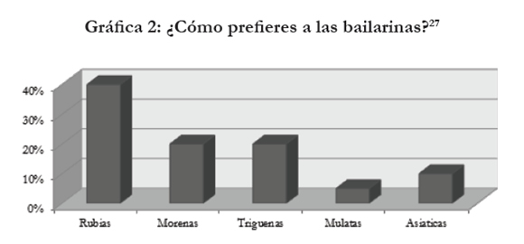Las preferencias de los asistentes masculinos reflejaban mucho de los gustos que se encontraban en los casi extintos cabarets, pero con un agregado racial, ya que los clientes mexicanos de los bares de table dance mostraron desde el principio una subrayada preferencia por las bailarinas rubias. La violencia simbólica ejercida en relación con el somatotipo de personas de tez blanca y cabello rubio ha sido una dinámica arraigada en la cultura mexicana.25 La modernización del país supuso, para las clases medias mexicanas, su americanización (Careaga, 1984). Una década antes, el escritor mexicano Carlos Monsiváis afirmaría un aforismo que logró una fuerte resonancia: 'Somos la primera generación de norteamericanos nacidos en México.'