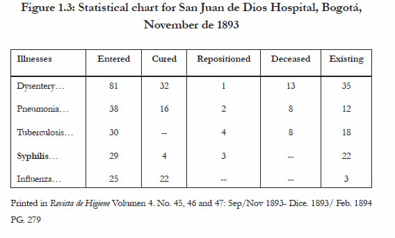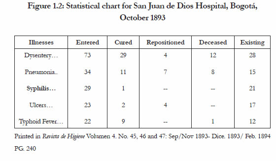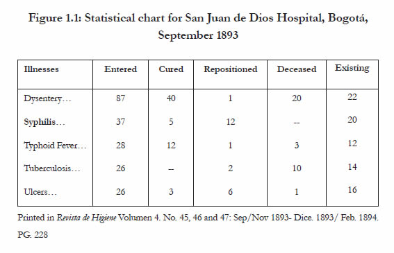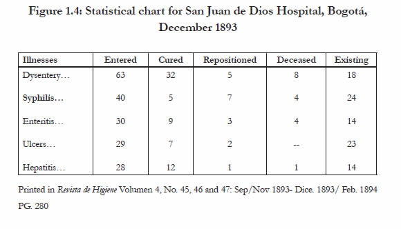 From 1886 to 1892, the Hospital de San Juan de Dios reported 2333 registered prostitutes, the majority of whom had been referred to the hospital by police authorities and treated for venereal infections, while a small percentage sought medical attention on a voluntary basis (Obregón, 2002: 167). Despite medical regulation of venereal disease and the establishment of government–sponsored programs of prophylaxis and treatment, the rate of venereal disease in the city did not subside. In 1893, syphilis continued to appear in statistics and medical charts as one of the city's leading causes of hospitalization (see figure 1.1 to 1.4) (Revista de Higiene, 1893). Statistics provided for the months of September through December 1893 indexed syphilis as a leading cause of hospitalization, second only to gastrointestinal conditions in Bogotá's Hospital de San Juan de Dios. Government approval of an extensive program of regulation would have to wait until 1907 (Obregón, 2002).