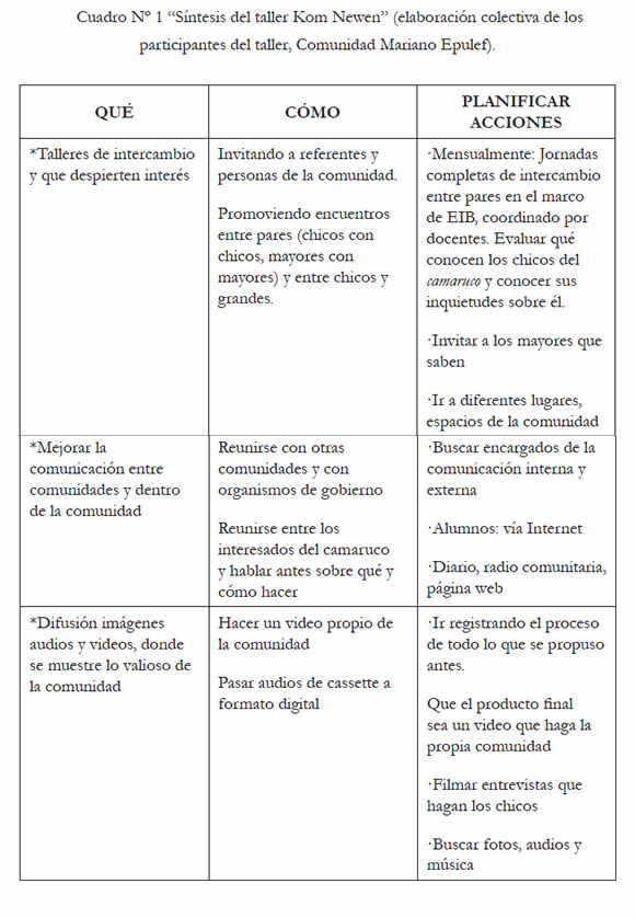 Atendiendo a las problemáticas a, b y d, la psicóloga y los docentes del Programa de Educación Intercultural diseñaron un taller con niños y pre–adolescentes. Bajo el formato de un programa de televisión sobre la historia y el presente de la comunidad, los menores pensaron preguntas para formular a personas mayores, seleccionadas por ellos mismos en razón de su conocimiento. Se distribuyeron diferentes roles con el uso del equipamiento necesario para grabar el audio, filmar, fotografiar, presentar y coordinar las preguntas. Luego se editó un video que sería socializado entre las instituciones.